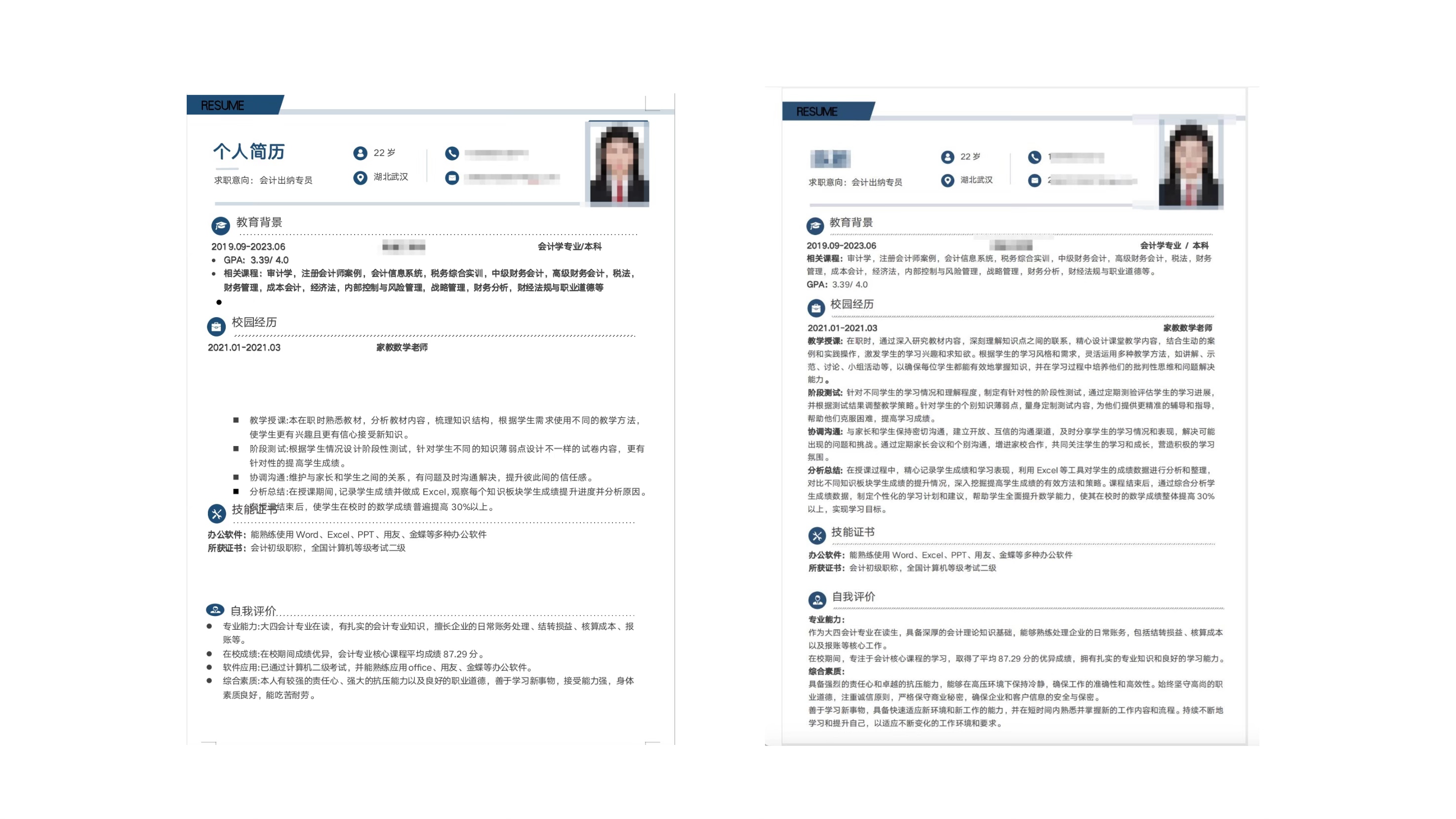 格式清晰,排版合理,根据过往经历和求职岗位匹配简历内容,重点突出,专业团队制作(HR+专业岗位面试官),项目深度挖掘,能力高度提炼,在简历中展现自己的优势!