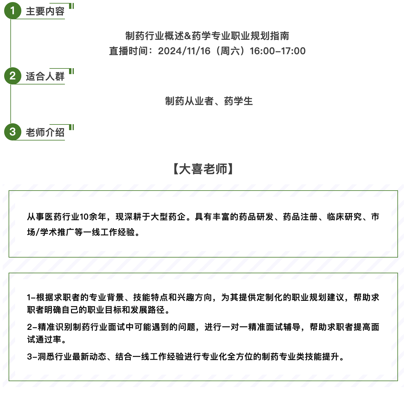 课程介绍:医药行业,药学专业,从事过药学专业相关的多个岗位,精通医药立项/注册申报/医药研发/临床药物数据分析 等,非常乐意给药学专业的同学讲解如何规划自己的职业,包含腾讯会议会议链接和入会密码,可以跟老师进行互动,包含但不限于连麦,评论区,自由讨论等。
